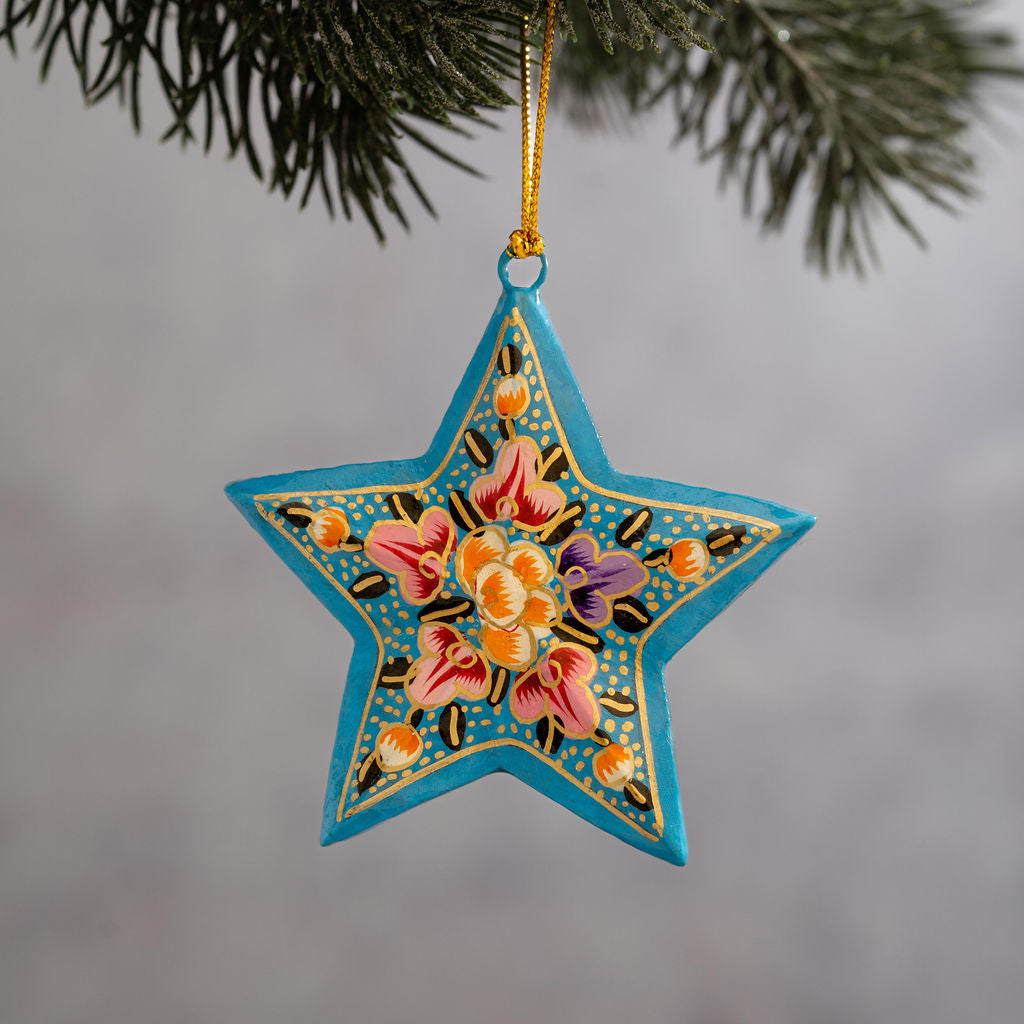 This 3D, 5 Pronged star has been hand carved from Native Indian wood. After which it has been hand painted by artisans in Kashmir India. This star measures approximately 7cm x 7cm.