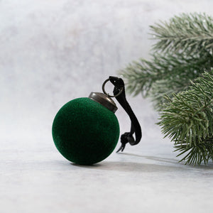 A handcrafted glass bauble, hand-blown in India, and then covered with a velvet flocking, which has then been hand coloured. A luxuriously texted bauble, measuring approximately 5cm.