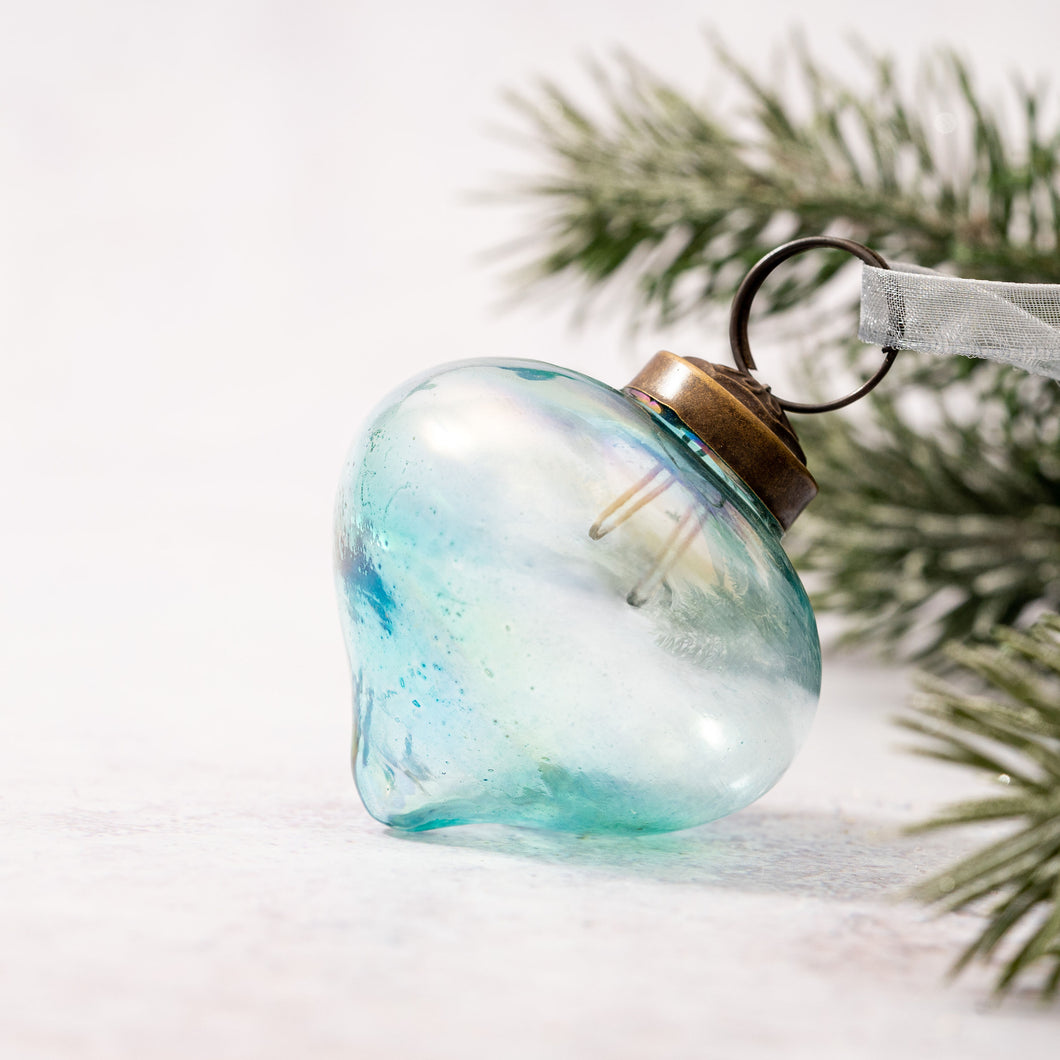 A medium sized hand blown glass lantern, with a luster finish. This finish is translucent and catches the light beautifully.