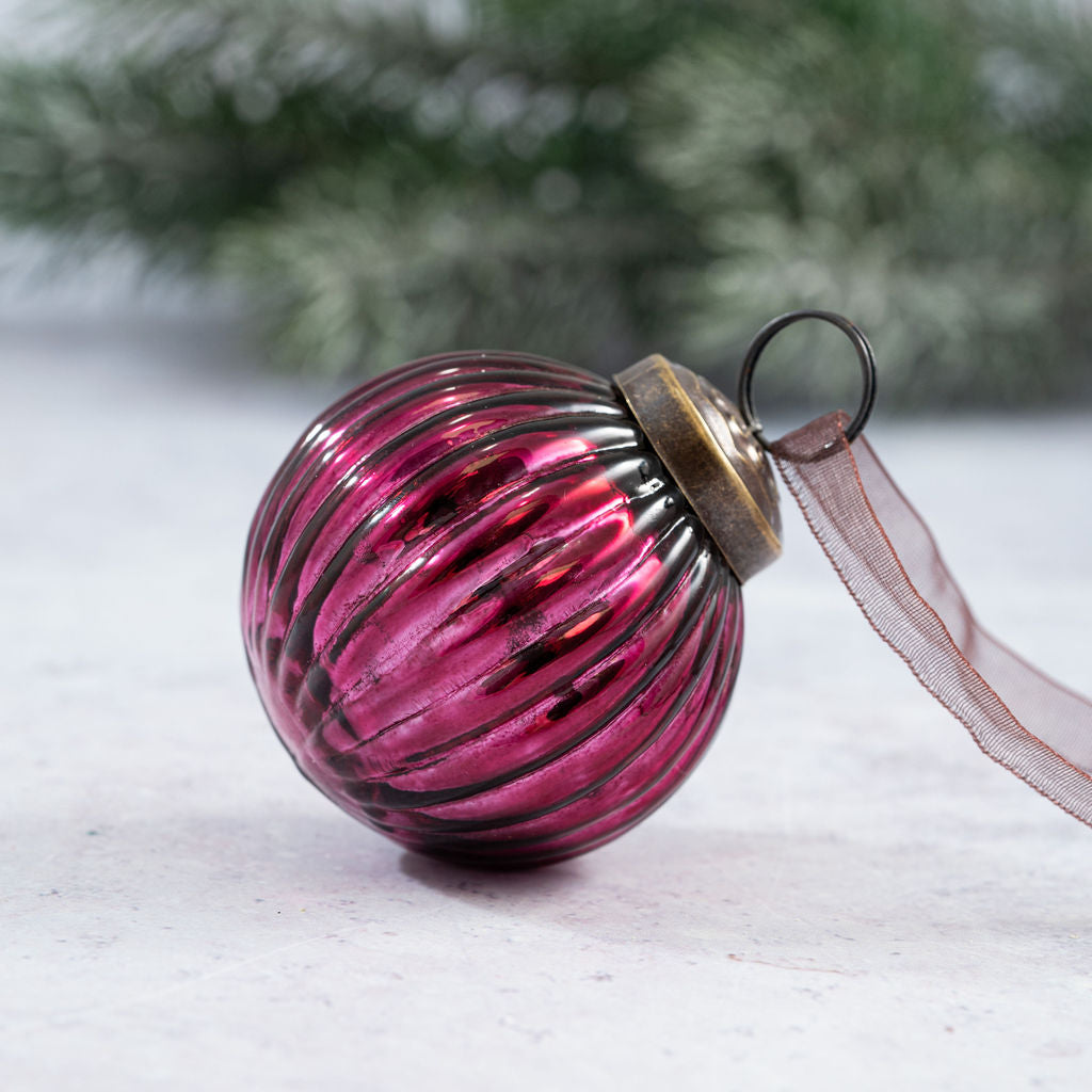 A Medium sized hand-blown ribbed glass ball. Approximately 5cm in size with an ornate bronze cap and co-ordinating coloured organza ribbon.
