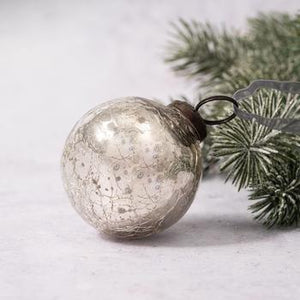 An Individually hand-blown coloured Crackle glass ball, measuring approximately 6cm in size. Each bauble has an ornately detailed bronze cap and co-ordinating coloured organza tie.