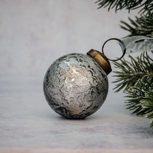 This bauble is of a single colour, and has a textured finish. The finish is made from a chemical reaction which occurs when specific chemicals are applied, when the glass is cooling, the exact texture and appearance will vary from one bauble to the next.