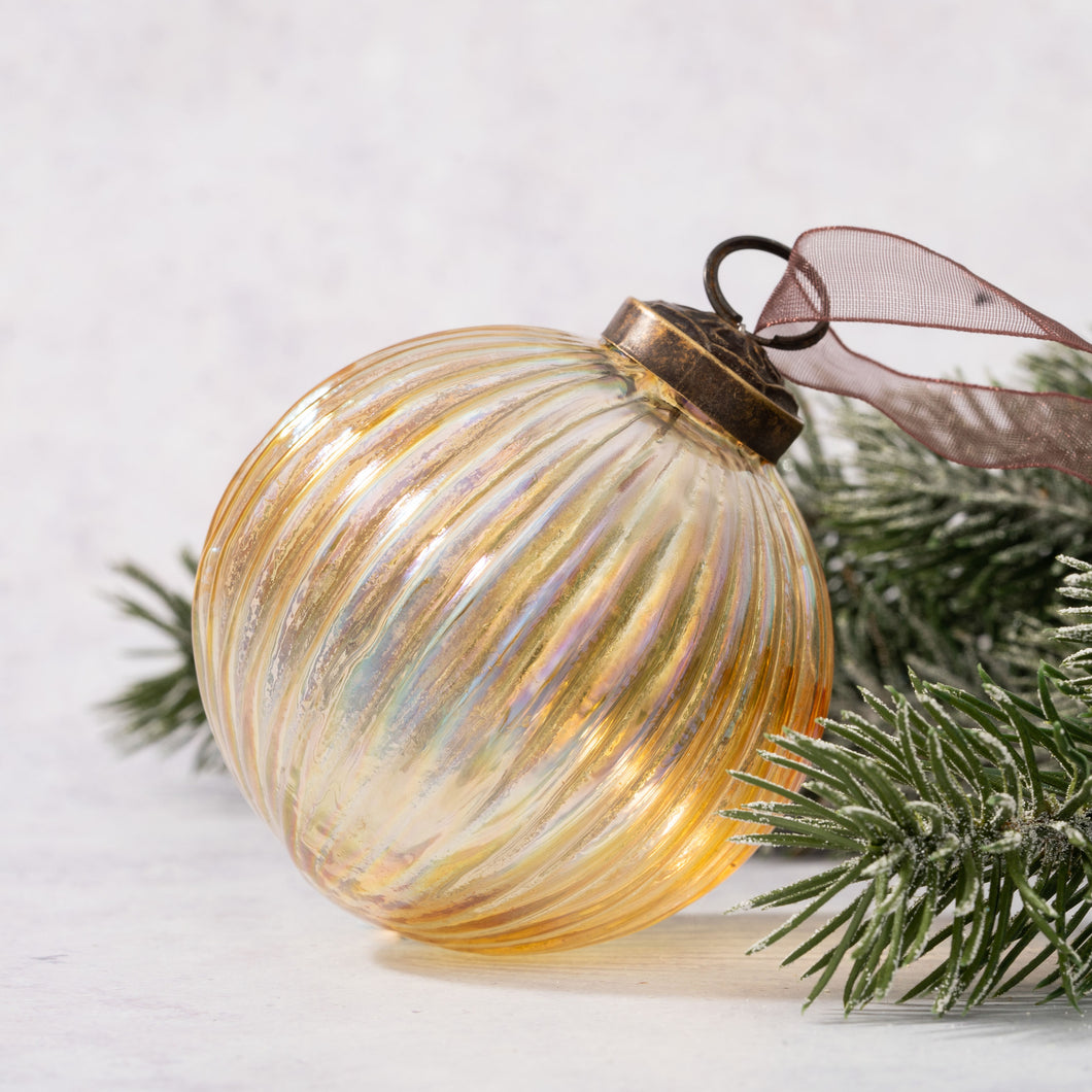 A hand blown, large ribbed bauble, finished with a Rainbow Luster effect. This beautiful bauble, will catch and reflect the light beautifully, creating a mirage of colours.
