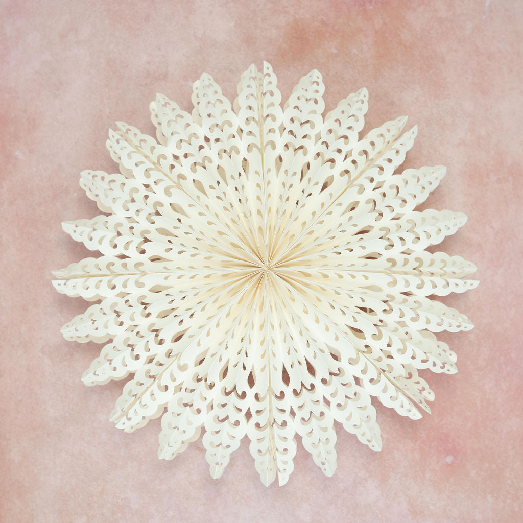This decoration is machine cut, ensuring no laser burns on the paper, is made from a heavy paper stock, and is assembled by hand, coming to you in a beautiful white storage/gift box.