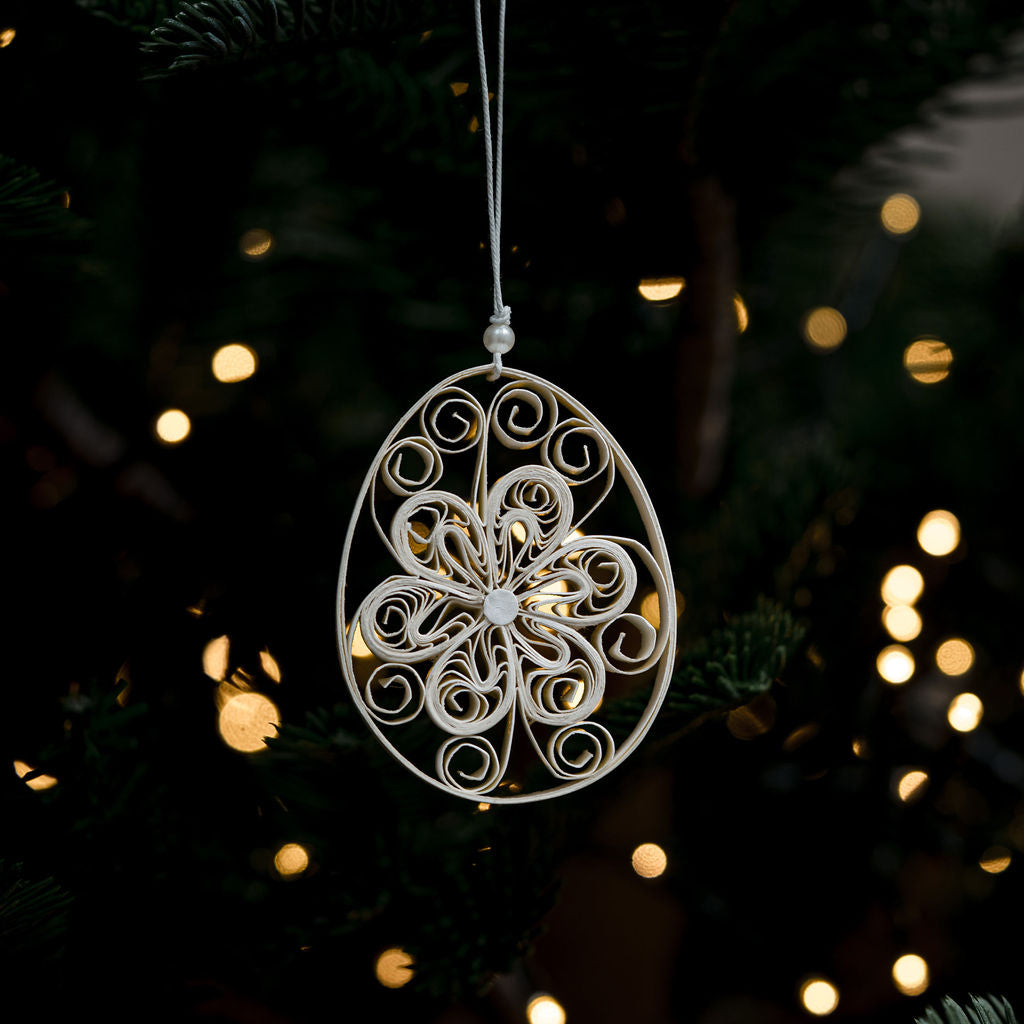 This beautiful quilled paper decoration, is hand-crafted and made from white paper, featuring a delicate white string hanger with beaded detail. It measures approximately 5cm x 7cm in diameter.
