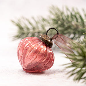 The ornament itself is a glass bauble that has a crackle glaze applied to the exterior when initially blown. This gives the glass a ‘crackled’ look. Each bauble has an ornately detailed bronze cap and co-ordinating coloured organza tie.