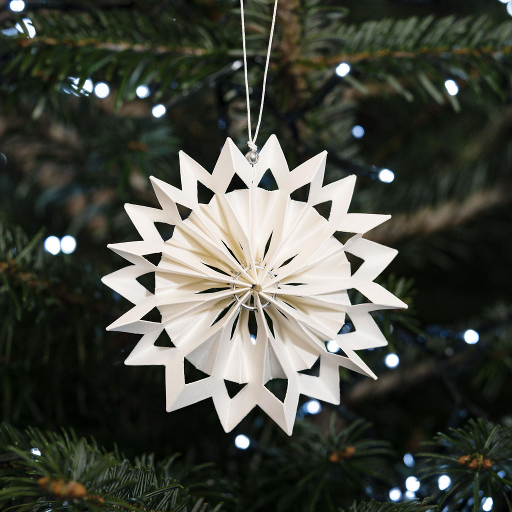This beautiful snowflake paper decoration, is machine-cut, and made from a sturdy white paper stock. It is assembled by hand, and features a delicate white string hanger with beaded detail. It measures approximately 10cm in diameter.